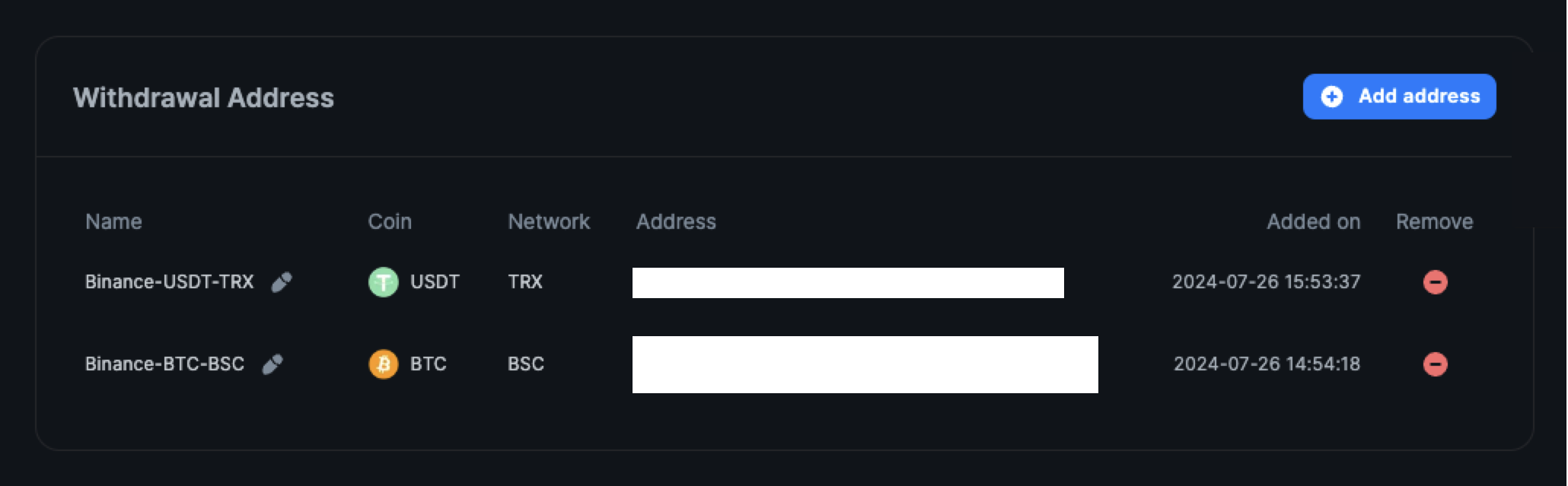 In My Profile > Withdrawal Address, you can register, delete, and rename withdrawal addresses.